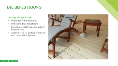 Die Befestigung Lösung: Accoya x Grad • Unsichtbare Befestigung • Unbeschädigte Oberfläche • Keine Materialschwächung durch seitliche Nut • Accoya-Holz ist barfußfreundlich und bildet keine Splitter