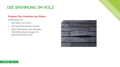 Die Spannung im Holz Problem: Das Verdrehen der Dielen Abhängig von • der Nähe zum Kern • der Ausrichtung der Fasern • dem Wachstum des Baumes entstehen Spannungen im gebräuchlichen Holz