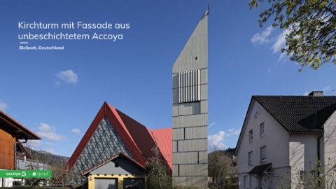 Kirchturm mit Fassade aus unbeschichtetem Accoya Bleibach, Deutschland 59